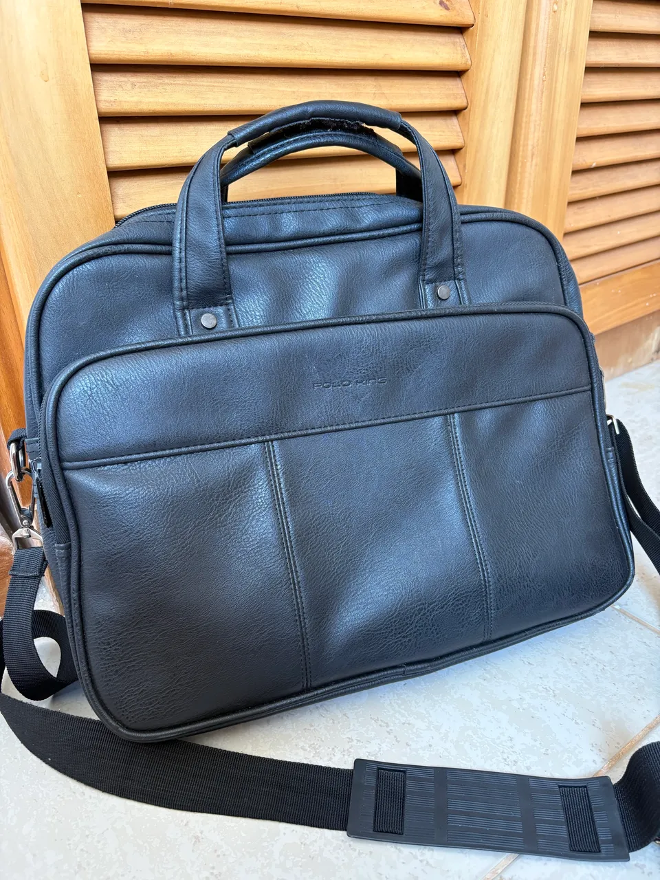 Pasta executiva Polo King preta, com design elegante e alça transversal. Perfeita para transportar seus documentos e acessórios de escritório com estilo e praticidade.