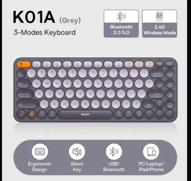 Teclado sem fio Bluetooth Baseus Especificações do produto: Nome: Baseus Criador Wireless Tri-Mode Teclado Modelo nenhum: K01B Tensão operacional: 3V Corrente operacional: 2mA Sistema compatível: Windows, Apple OS, Linux, Harmony OS, Android Tamanho do produto: 394,39x123,84x21,99mm Peso líquido: 460,0g (incluindo o receptor USB, não inclui baterias) OBS: **NÃO INCLUI O MOUSE, É VENDIDO SEPARADO** R$280,00 Garantia: 90 dias